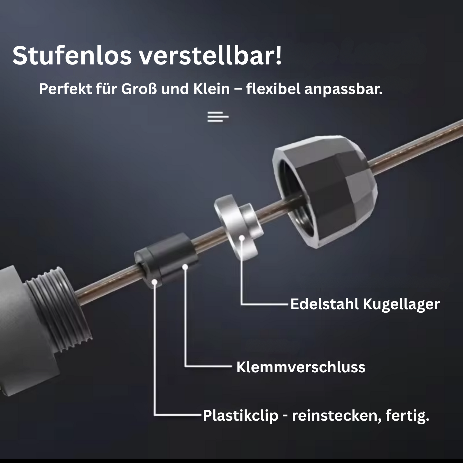 Das Seil selbst besteht aus einem Stahlkern mit schützender Gummimantelung – robust, langlebig und optimal fürs Indoor- und Outdoor-Training. Die angenehmen Schaumstoffgriffe liegen weich in der Hand, absorbieren Feuchtigkeit und bieten selbst bei schweißtreibenden Sessions sicheren Halt. Zusätzlich ist das Seil längenverstellbar – so kannst du es schnell und einfach an deine Körpergröße anpassen.